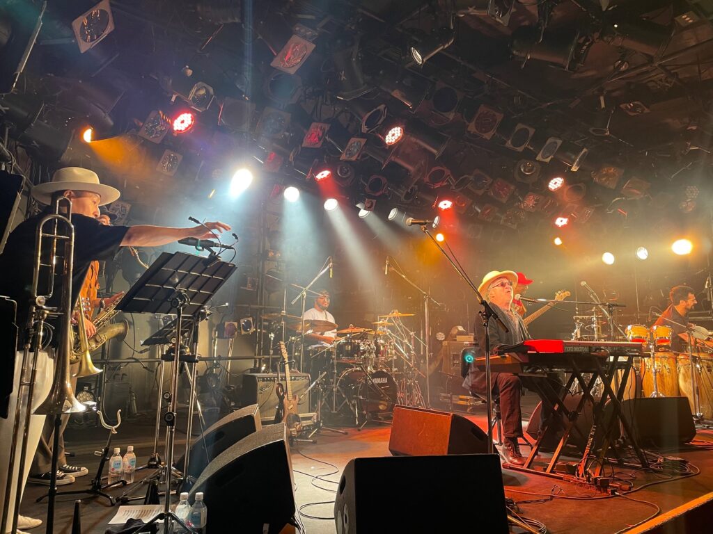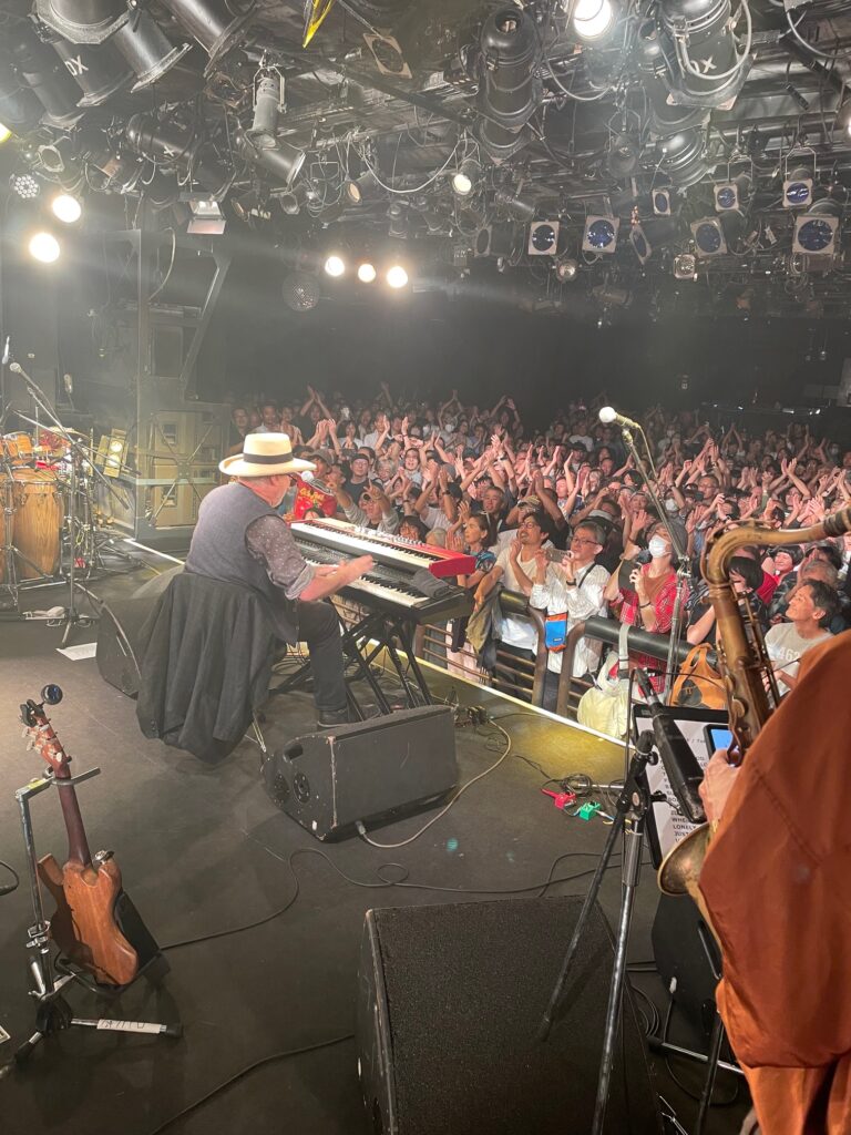 オープニングはリー・ドーシーの「Lottie Mo」から。ルーズで滑らかなシンコペイションは聴く者の体を揺らし、我々をニューオーリンズの街中へと放り込む。サックス・ソロでは「Iko Iko」のブリッジで聴きなれたフレーズが飛び出し、こういう隠し味に触れると私はいきなりハイになる。いつものようにニューオーリンズの先達に寄せるリスペクトを忘れない。プロフェッサー・ロングヘアの「Tipitina」を改作した「Fessa Longhair Boogaloo」ではパーカッション・ソロを入れてカリビアン・テイストをふんだんに盛り込む。この展開が素晴らしく、ホーンとの掛け合いとキューバン・ピアノのソロ、そしてブレイクを巧みに盛り込んでもう大変!てな感じである。アール・キングのバッキングを務めたことがあると語り歌い始めたのが、「Those Lonely, Lonely Nights」。そういえばニューオーリンズでスヌークス・イーグリンやアール・キングのバックで弾くジョンをその昔に観たな、なんて個人的な思い出が蘇る中でこのメランコリックなブルース・バラードに耳を傾けた。大きなどよめきが出たのは日本ではお馴染みだね、とドクター・ジョンの名が発せられた瞬間だった。「Such A Night」を演ってくれるとは。会場のみんなと一緒に歌うなんて楽しすぎる。