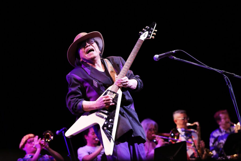 下手からJune Yamagishiが現れた瞬間、「わっ、アルバート・キングだ!」と駆け出したくなる。紫のジャケットにハット、パイプ、そしてフライングV。