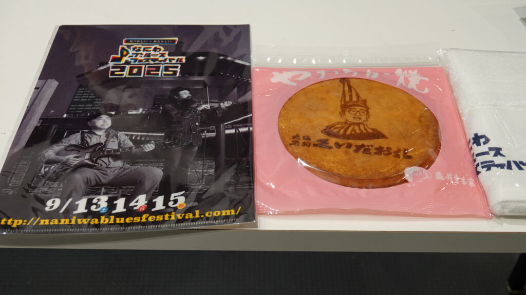 それに先立ち、1階または2階の最前列を確約し、おみやげも付く「ブルースシート」は早々に完売。例年はハーモニカが同封されていたが、「キーが出尽くしたので」とのことで今年は大判の“くいだおれ太郎”刻印入り「やわらか焼き」! 神戸の亀井堂総本店は瓦せんべい発祥の老舗。神戸×大阪のコラボ、楽しいなあ。