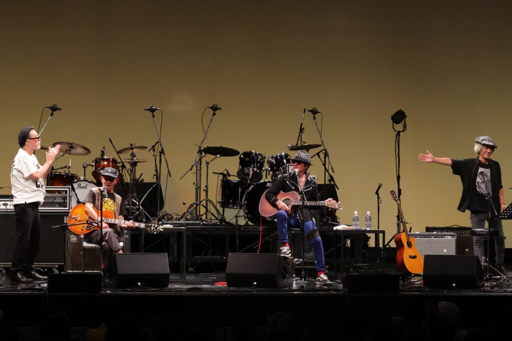 一人でやっても寂しいのでと三宅伸治が呼び込まれ手拍子と共に〈アイスクリンマン〉。「ちょっとチューニングしていい? では呼びます、有山じゅんじ」 軽く〈第三の男〉を奏でる中、客席は固唾を呑んで見守る。「この際ですから例のあの人を呼びますか」ざわざわと揺れる会場。「どうする?呼ぶ?呼ぶか?…木村充揮です」 現れた木村も「うちだかんたろぉぉ!」と笑顔はみせるが表情は少し固いように見えた。「水でも飲もうかな」と息をつく勘太郎。ギター4人で懐かしい曲やりますとさりげなく歌い始めたのは〈街のほこり〉。尾関真の書いた曲だ。有山も歌う。詰まりそうで縮まらない距離。じれったい。