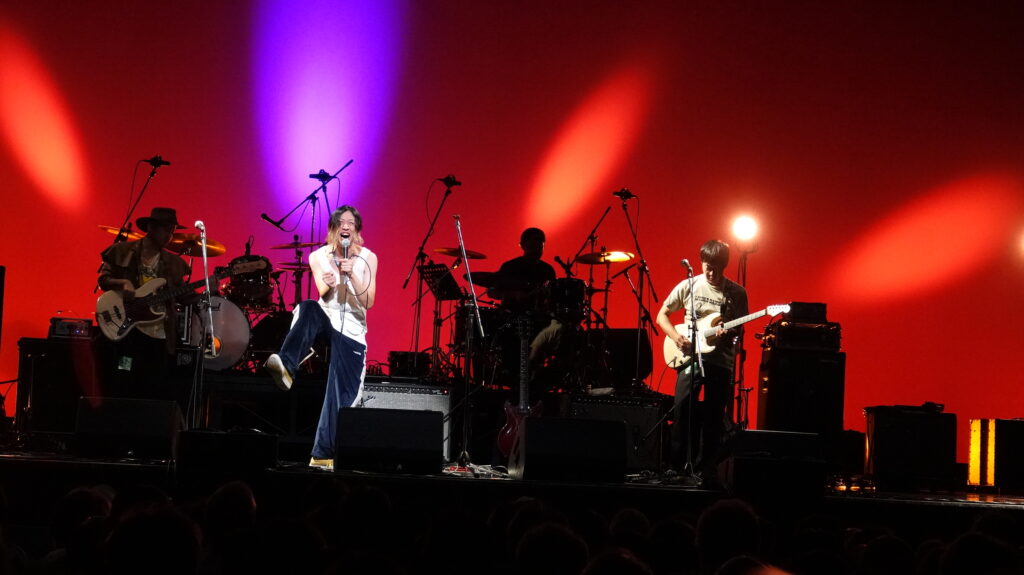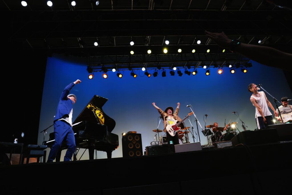 「唄って踊って救われる。音楽の力を信じたいんや」——求める世界は見えている。それをさらりと歌える素直さも魅力だ。結成は2010年・京都。現在はドラマー脱退後、都度ゲストを迎えており、この日はフェス常連の髙木太郎がスケール感を後押し。当初はノース・ミシシッピ・オールスターズを思わせたが、いまは根から吸い上げた憧れを糧に自由に枝葉を伸ばしている。レゲエ調の〈ラブやで〉から、ブルーグラス、ファンク、ゴスペルのグルーヴで上昇する〈HEISEI HIPPIE〉まで、自在に泳いでいった。