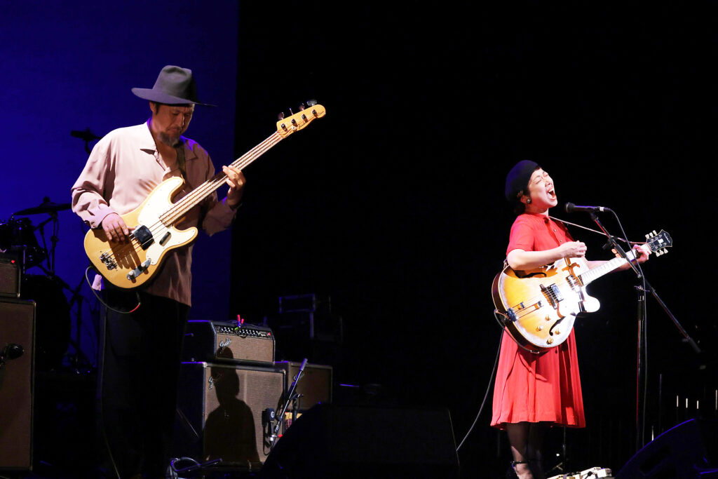ティージロスの発音は東京と大阪で違うらしい。ともあれ活動の場を広げる二人は、この夜もデュオで思い切りのいいステージ。〈はきだめの愛〉の第一声に衝撃を受けた人も多かったはず。ギターを掻き鳴らし、ドスの効いた声でドレスの裾をはだけて吠える伊東妙子。クールにベースを刻む篠田智仁。「100年ほど前のブルース・ナンバーで」と始めたのは、ベッシー・スミス〈Send Me To The ’Lectric Chair〉に日本語詞をつけた、吾妻光良も絶賛の〈電気椅子〉。地面に身体を投げ出すような〈スローバラード〉と、カヴァー2曲でがっつり掴む。